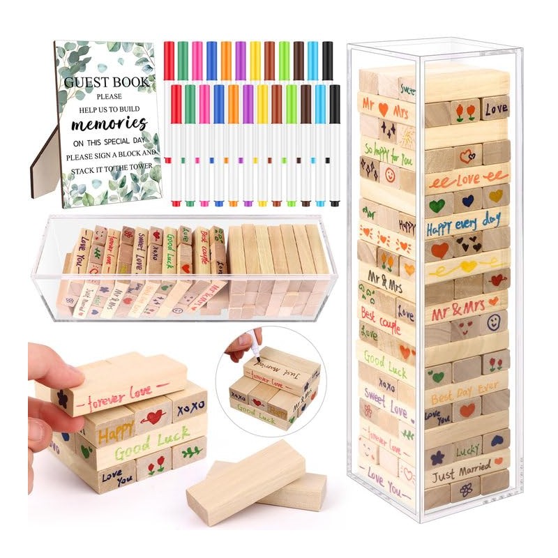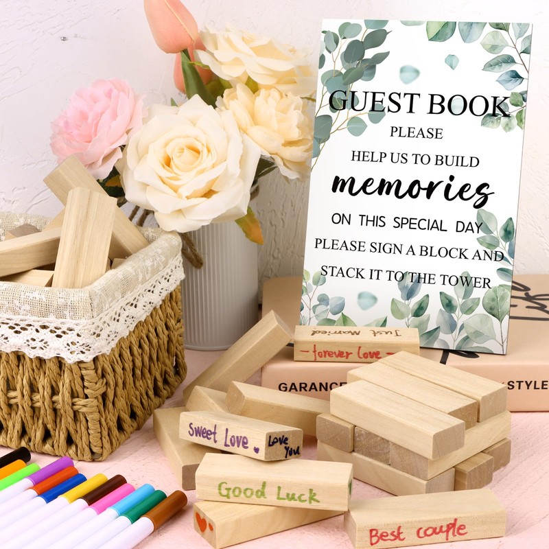 - 【Wedding Exclusive Memory】A unique and interesting wedding guestbook that keeps your special day forever.Your guests can write their names,wishes,and advice on the wood blocks to build into a tower of love.Our guest book can makes a exclusive decoration in your home ,and allows you to always remember everyone that come and all the good memories that were made.