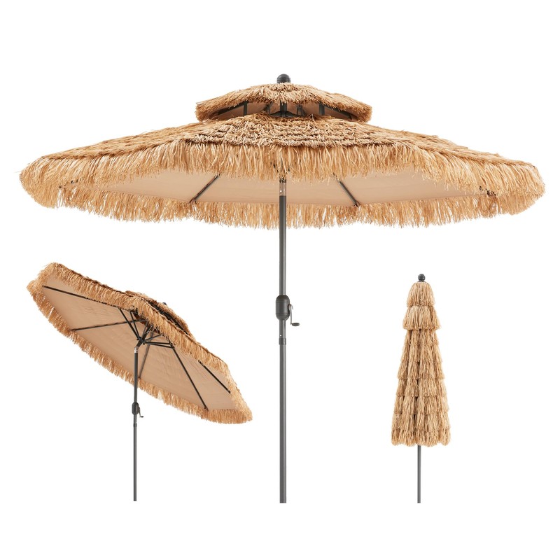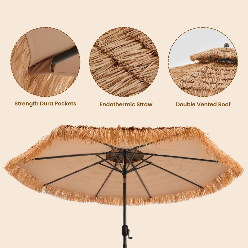 - Two Sizes:Choose between a 9FT or 10FT diameter canopy to match your outdoor needs. Perfect for cozy backyard patios, sprawling beach days, lively poolside lounges, or vibrant tiki-themed parties—this thatched umbrella adapts to create a tropical oasis wherever you go.