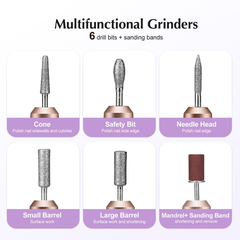 - Multifunctional Nail Drill Kit: With adjustable various speeds and 6 different nail drill bits, this electric nail file can polish or remove acrylic, gel, and dip powder nails, as well as tackle thick nails and cuticle dead skin