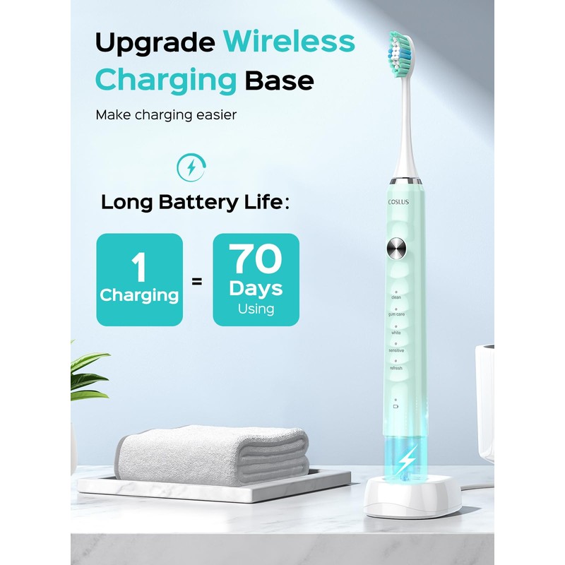 - With Ugrade Wireless Charging Base and Travel Case, Easier to Charge and Travel: COSLUS electric toothbrush for adults and kids comes with an upgraded wireless charging base, which makes charging more convenient and faster. This electric travel toothbrush can last for 70 days after 1 charging, which is twice as long as others. It also comes with a travel storage box, making it the ideal choice for your travel or office