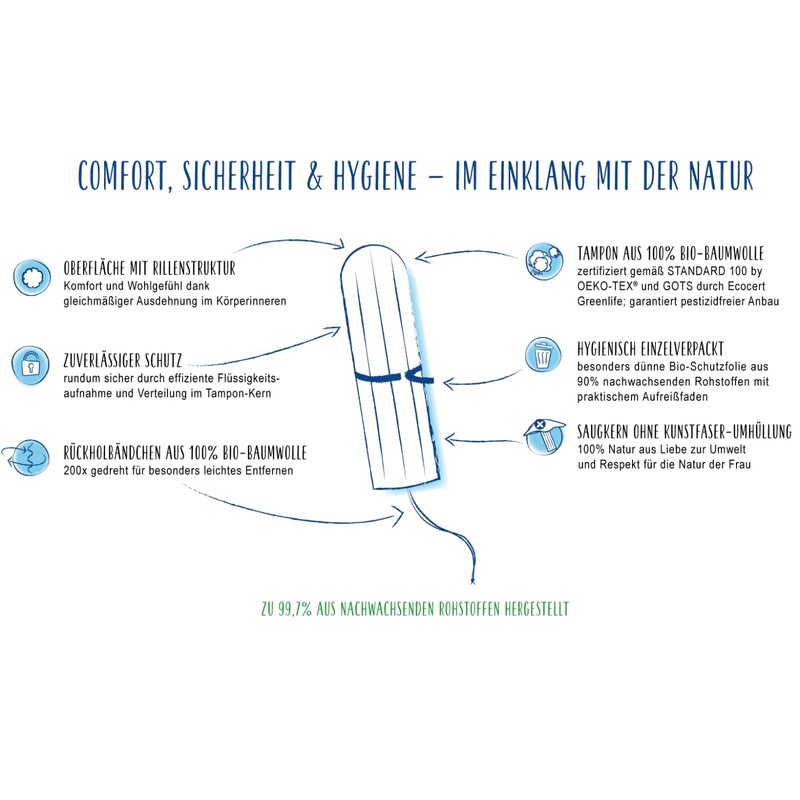 - Sustainable: for our tampons we use skin-friendly, 100% eco-certified organic cotton. Thanks to renewable natural fibres without chemicals and animal testing, this is also good for the environment. Guaranteed pesticide free.