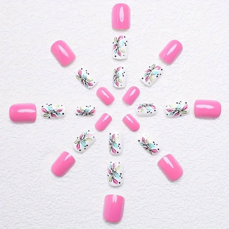Cosmeria 24 Pieces Press on Nails, Short Square Fake Nails with Floral Design, Full Cover Artificial Fingernails, Glossy Stick on Nails, Pink