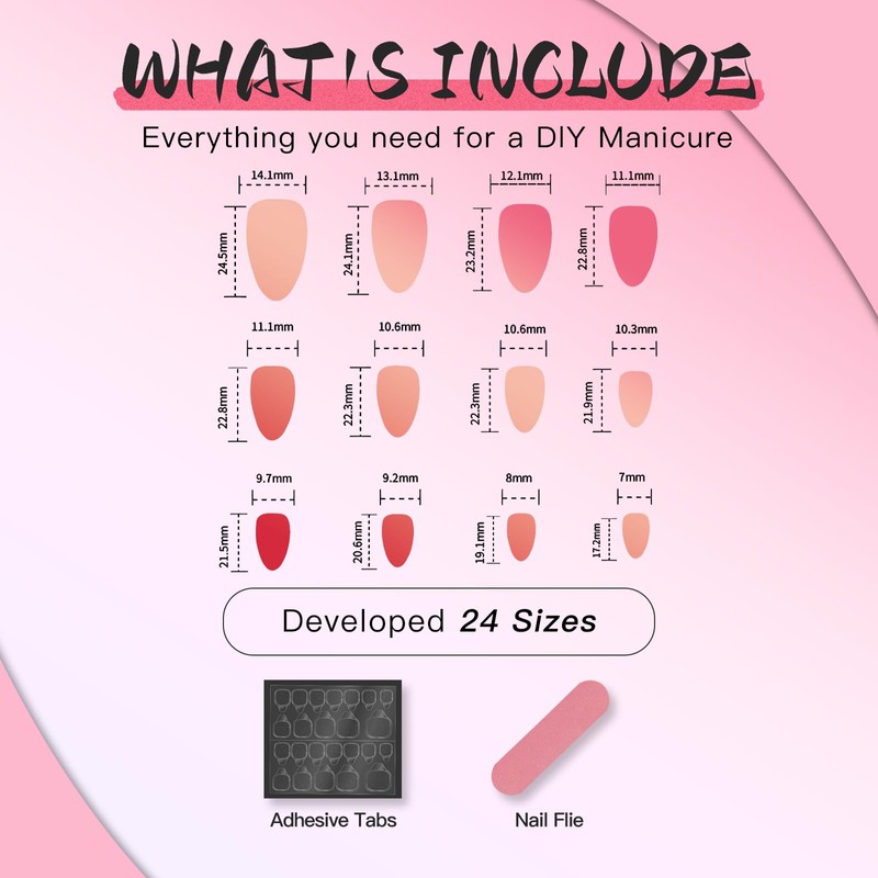 - Individually adjustable sizes: the set contains 24 Cosmeria fake nails in 12 different sizes, which can be easily adjusted to fit your nails. You can trim and file the nails as you like to find the perfect fit
