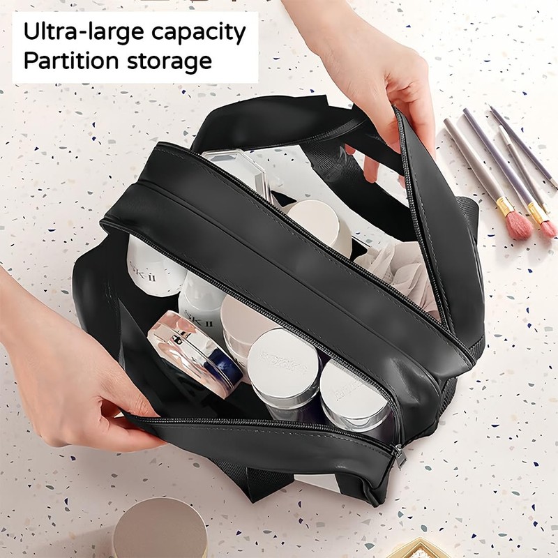 - Enjoy easy access with a large double zipper. This stylish, practical bag fits perfectly in your bathroom, bedroom or suitcase.