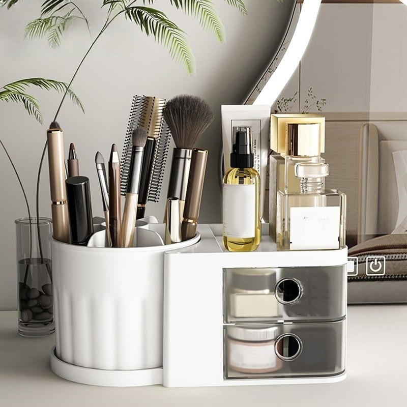 - Quick Access Functionality: Featuring a smooth rotation mechanism, this makeup organizer ensures time-saving efficiency with quick item location and easy drawer access for effortless organization