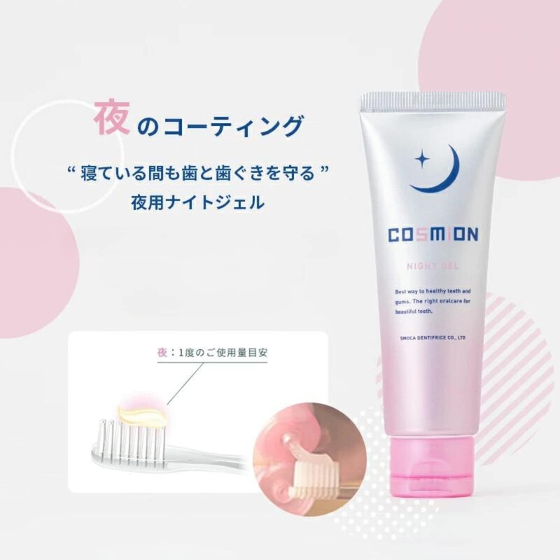 - (It does not bubble, and is easy to polish and will keep your mouth clean after rinsing. [Cosmion] Night gel has developed the concept of "protecting teeth and gums while sleeping". Because it has been coated for a long period of time due to oral issues, it is more effective when you sleep without food getting inside your mouth