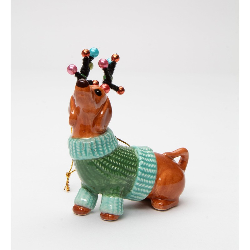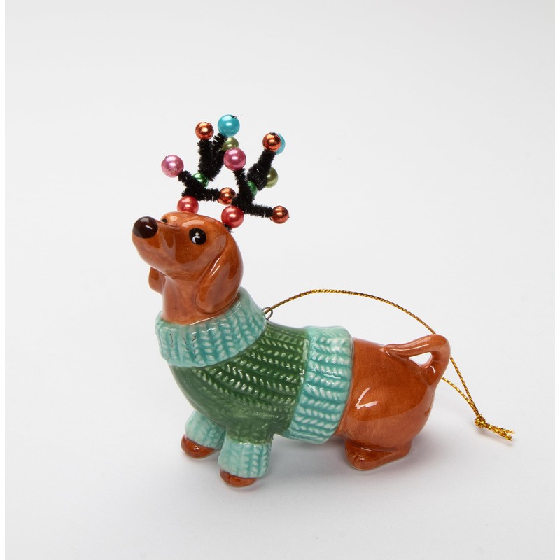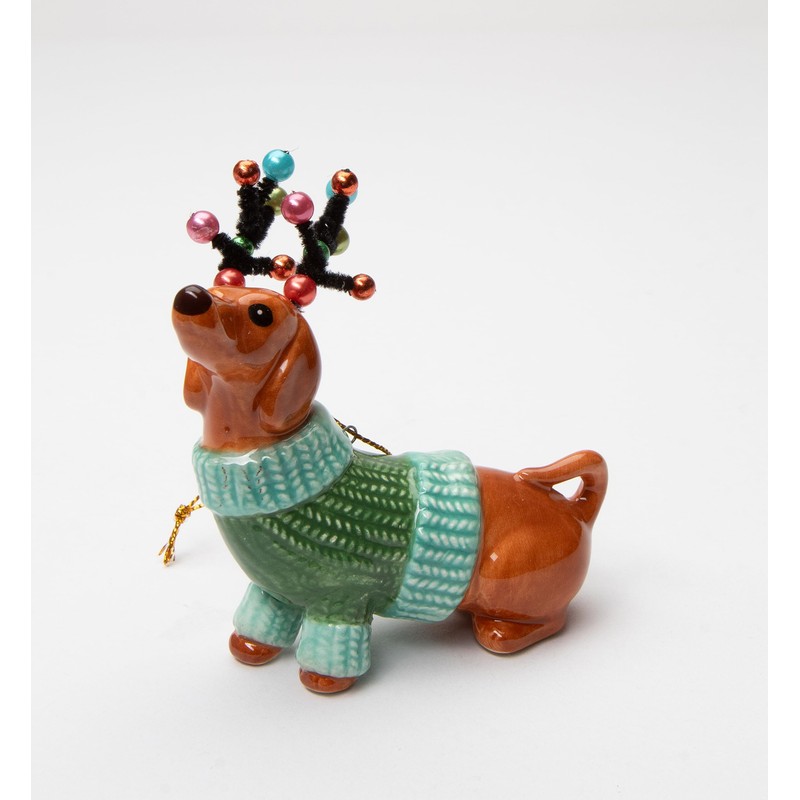 Cosmos Gifts 57012 Dachshund Dog in a Green Sweater with Reindeer Antlers Ornament, Multi-Colored, 3 3/8" x 1 5/8" x 3 7/8" H