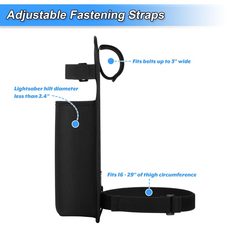 • 【Adjustable Fastening Straps】Equipped with a hook and loop closure, you can easily adjust the size of belt loops, thigh straps, and hilt fastening straps. Fits belt up to 3 inches, 16“-29" of thigh circumference and lightsaber hilt less than 2.4 inches in diameter. Fits lightsabers over 26cm/10.2 inches in length.
