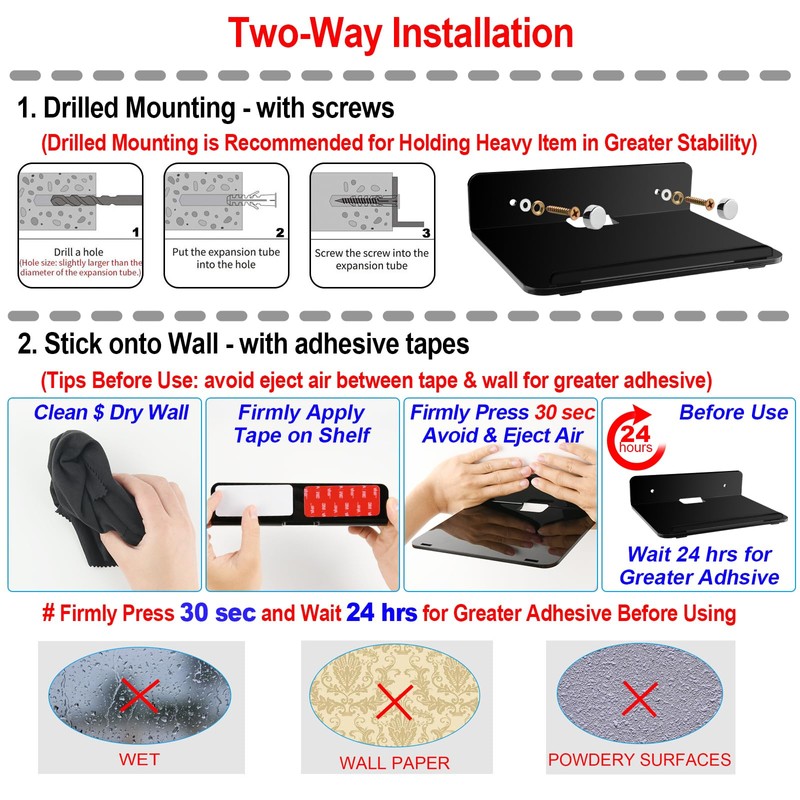 2) Stick on wall with Self Ahesive Tape: Clean the wall and keep it dry, stick on the back of display shelf, then press onto wall firmly for 30 seconds and wait 24 hourrs for greater adhesiveness before placing item on the shelf.