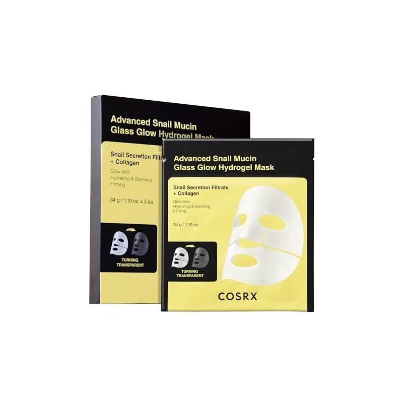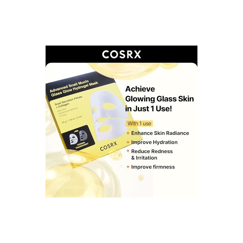 COSRX Advanced Snail Mucin Glass Glow Hydrogel Face Masks Skincare 3 EA, Collagen Face Mask, Travel Essentials, Overnight Face Mask, Korean Skin Care