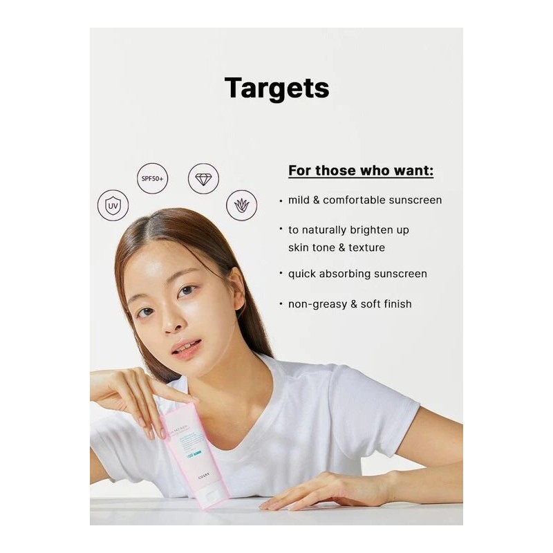 Aloe vera for soothing and calming the skin tone; Pink Tone Up Aqua Tone Up Sun Screen for skin tone-up effect With SPF50+ PA++++, the sunscreen effectively blocks out UV rays while providing a lively and natural pink coating for the skin tone. After multiple tests, the product uses a pink color that enhances the skin's brightness, without leaving a white cast. The sunscreen delivers a smooth and soft finish, filling in pores and fine lines, and creating a rose petal-like skin texture. After primary skin irritation testing, it is a low-irritant product for the skin. It is suitable for those who want a natural and lively tone-up effect, as well as those who seek a moisturizing and mild sunscreen like a skin care product, and those who want to achieve a pretty pink water-glow skin without stickiness or greasiness. Also suitable for those who want a tone-up sunscreen that can be used easily for basic care without foundation, and those who want to enhance the brightness and adhesion of their skin before applying makeup.