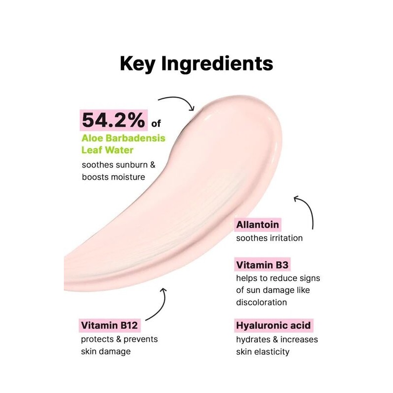 - Ingredients: Aloe Barbadensis Leaf Water (54.2%), Homosalate, Butylene Glycol, Diethylamino Hydroxybenzoyl Hexyl Benzoate, Ethylhexyl Salicylate, Glycerin, Water, Bis-Ethylhexyloxyphenol Methoxyphenyl Triazine, C12-15 Alkyl Benzoate, Methyl Trimethicone, Niacinamide, Titanium Dioxide (CI 77891), Diisopropyl Sebacate, Terephthalylidene Dicamphor Sulfonic Acid, 1,2-Hexanediol, Potassium Cetyl Phosphate, Cetearyl Alcohol, Tromethamine, Glyceryl Stearate, Behenyl Alcohol, Polyacrylate Crosspolymer-6, Xanthan Gum, Sodium Polyacryloyldimethyl Taurate, Hydrogenated Lecithin, Poly C10-30 Alkyl Acrylate, Ethylhexylglycerin, Stearic Acid, Aluminum Hydroxide, Polyglyceryl-3 Methylglucose Distearate, Palmitic Acid, Iron Oxide Red, Disodium EDTA, Triethoxycaprylylsilane, Iron Oxide Yellow, Sodium Hyaluronate, Allantoin, Myristic Acid, Cyanocobalamin, Lauric Acid, Tocopherol