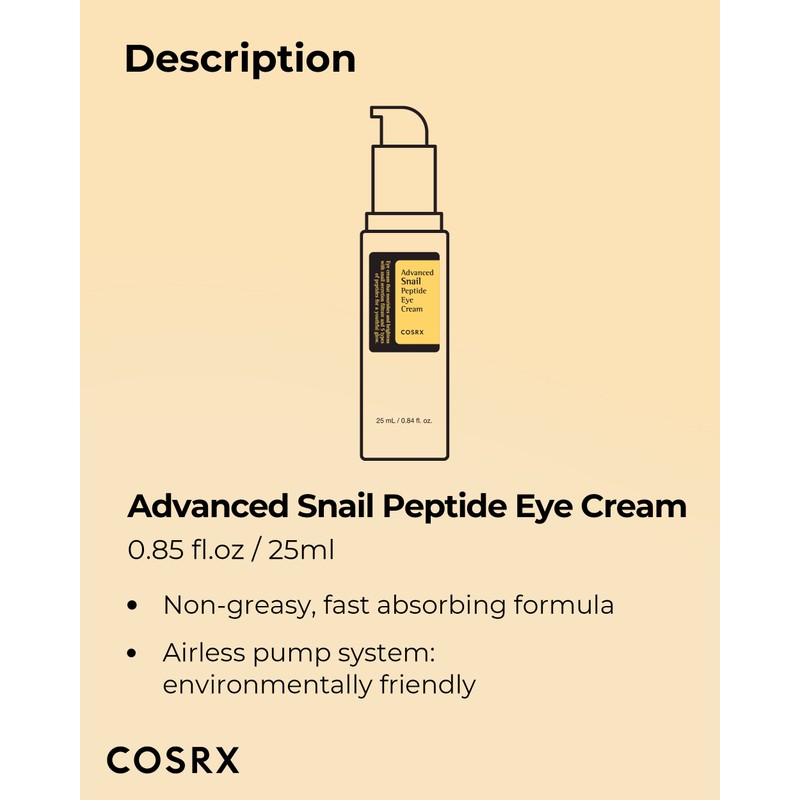 COSRX COSRX Snail Mucin Peptide Under Eye Cream, 0.84 fl oz, 73.7% Snail Mucin and Niacinamide, Eye Care, Eye Cream Anti Aging, Dark Circles, Korean Skin Care