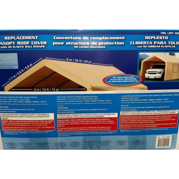 - Roof cover is sized to fit certain canopy frames: 3 m x 6 m | 10 ft x 20 ft | 10 pi x 20 pi