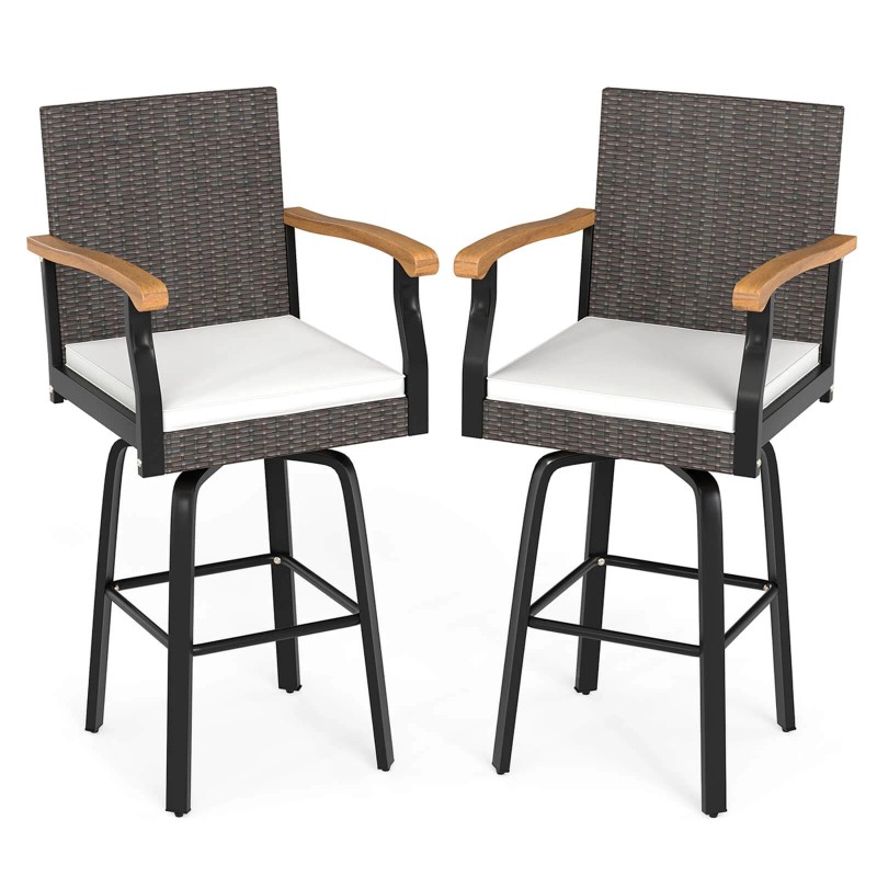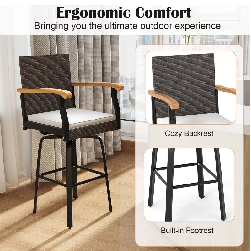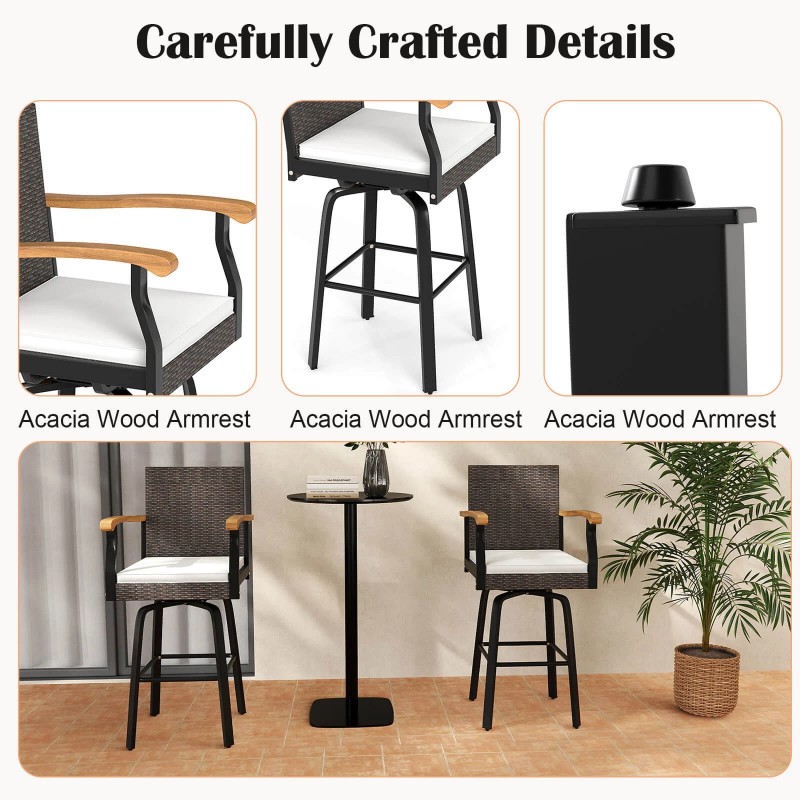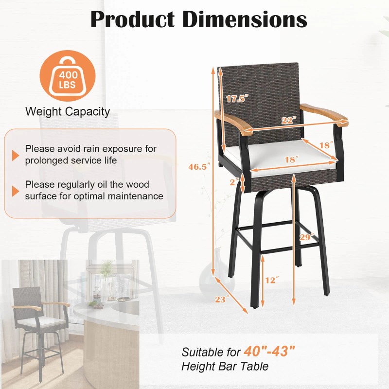- Set Includes: 2 x Patio Swivel Barstool, 2 x Seat Cushion, 1 x Instruction