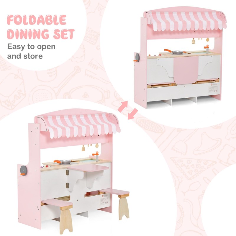 - 【2-In-1 Play Kitchen & Restaurant】 The front side of the play kitchen is equipped with stove, oven, sink and more to allow kids to pretend to grill and cook food. Plus, the back side features foldable dining set, which is easy to open and store, and offers an ideal place for eating.