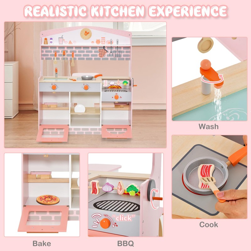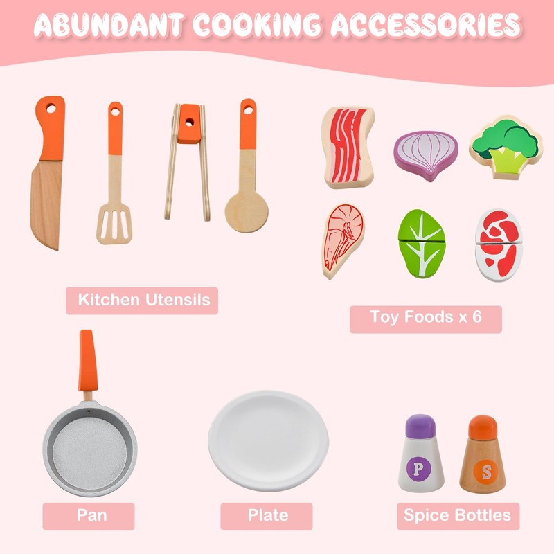- 【Realistic Cooking Experience】This wooden kitchen toy set offers kids realistic facilities to pretend wash, cook, BBQ and bake, letting them enjoy immersive kitchen experience. Besides, the play kitchen comes with abundant cooking accessories, like kitchen utensils, food toy x 6, pan, plate, spice bottles.
