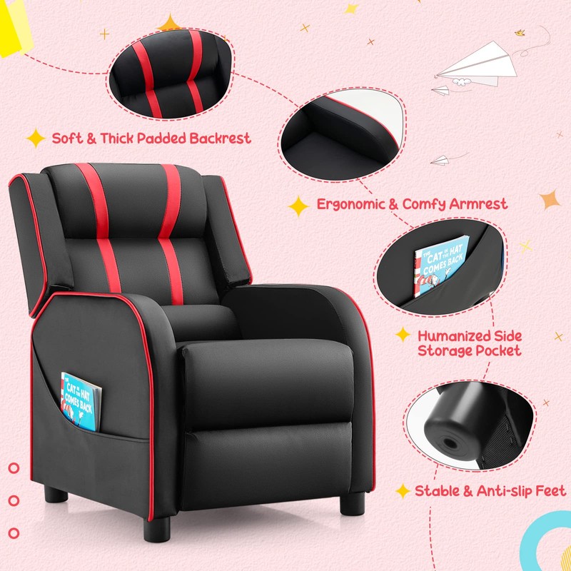 Costzon Kids Recliner, Gaming Recliner Chair w/Side Pockets, Footrest, Headrest & Lumbar Support for Kids Room & Play Room, Adjustable Racing Style Leather Sofa for Children Boys Girls (Red, Black)