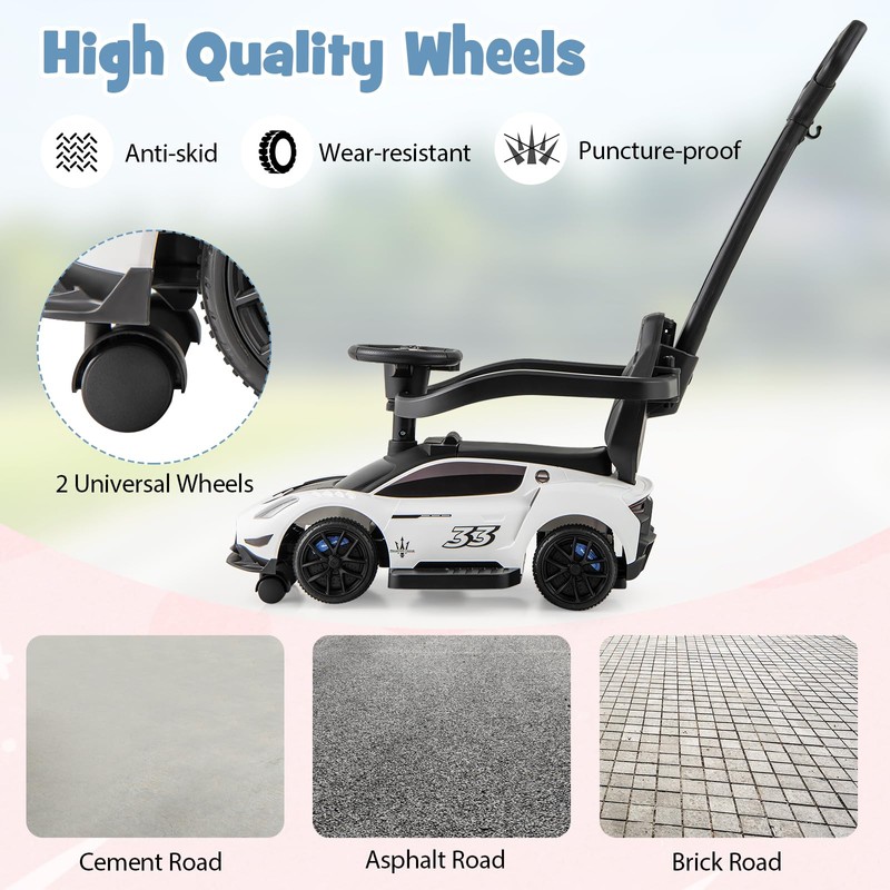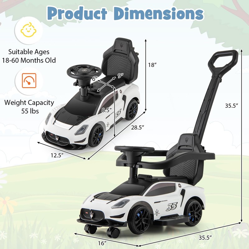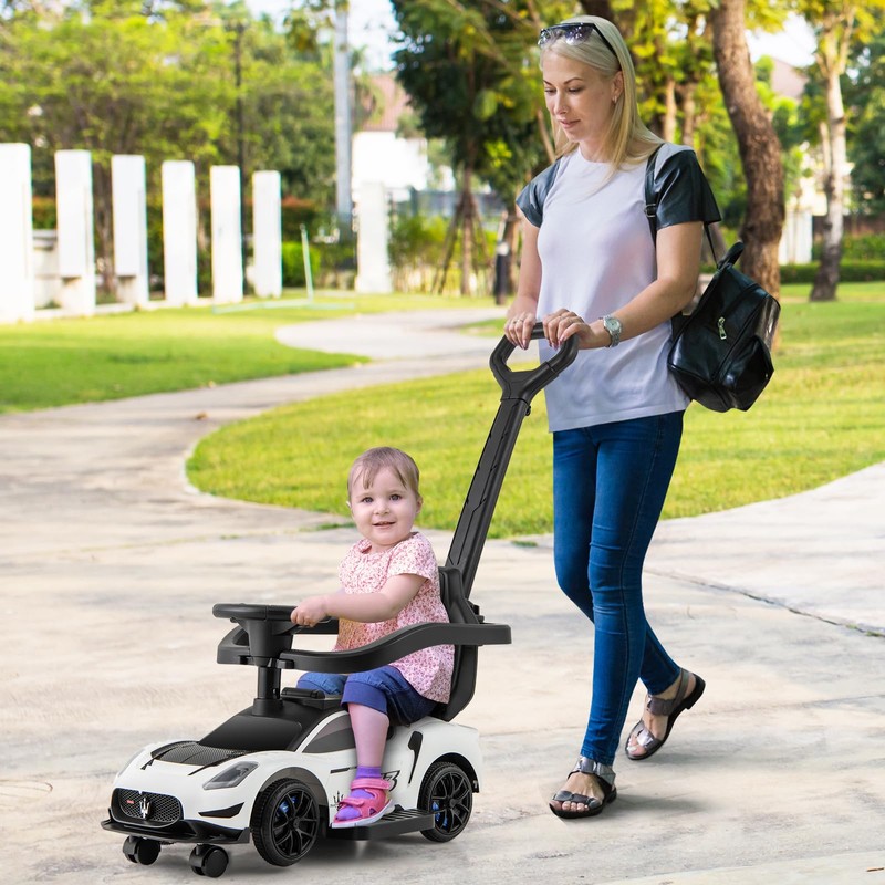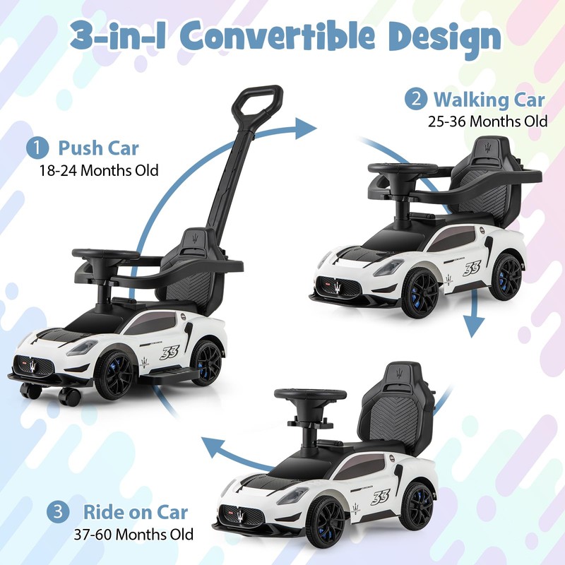 Costzon Push Car for Toddlers, 3 in 1 Licensed Maserati Stroller Sliding Walking Car with Handle, Guardrail, Under Seat Storage, Horn & Music, Foot to Floor Kids Ride On Toys for Boys Girls (White)