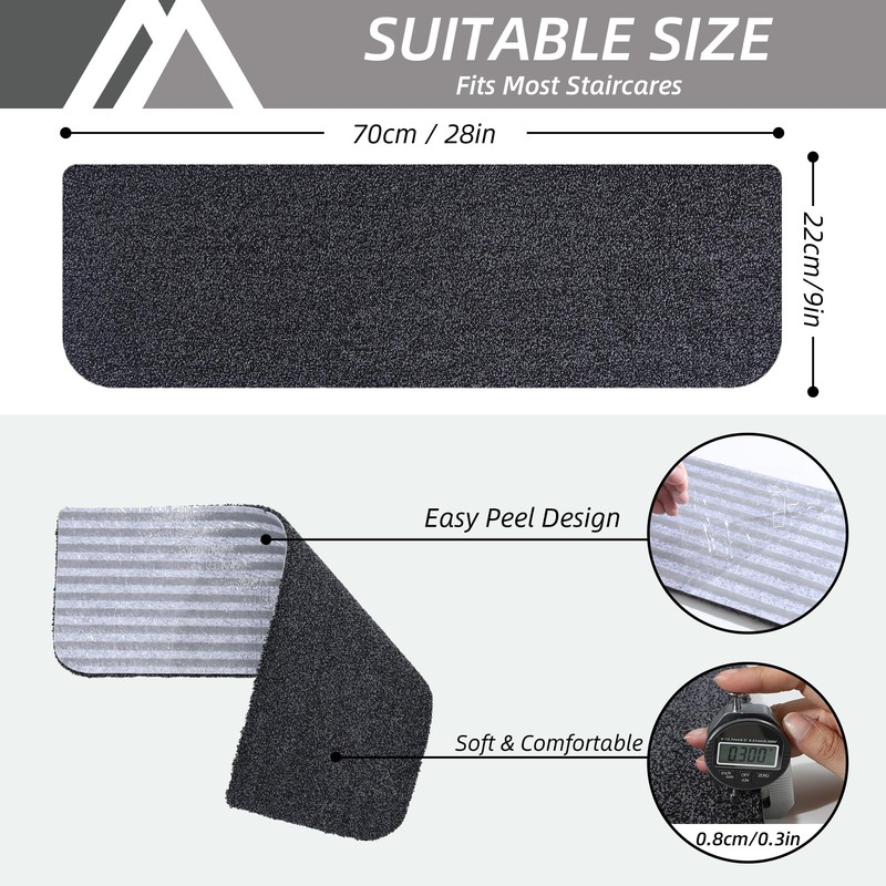 - Stair Treads Mat Dimensions: Each mat measures 28" x 9"with a thickness of 0.4". Crafted from 100% polyester for durability and comfort