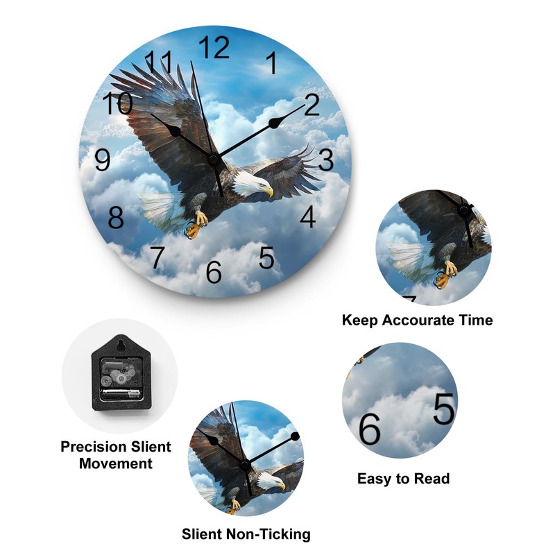 - Advantage: This eagle animal blue sky and white clouds wall clock is made of and sturdy PVC which can be used for a long time. no frame nor glass cover design,can be easily cleaned without disassembly,the dial of the eagle animal blue sky and white clouds wall clock is simple and the numbers are clear,easy to read. High quality silent sweep movement keeps accurate time and absolutely silent environment in day and night.