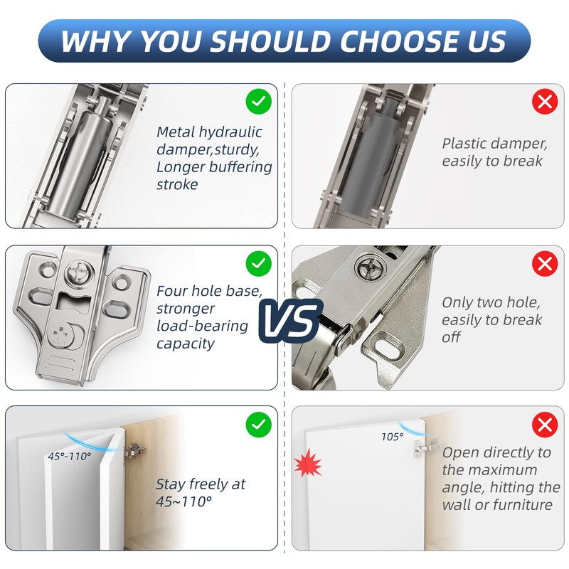• Silence Hinges: Made with built-in dampers, our cabinet hingers make doors close with a smooth silent motion for quieter and safer home environment. The hinges can open and keep the doors between 45 and 110 degrees for avoiding collision with the adjacent doors or walls.