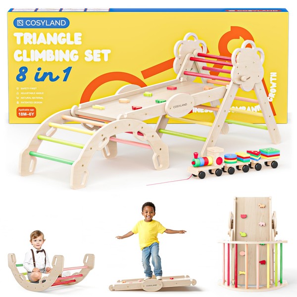 COSYLAND Pikler Triangle Set 8 in 1 - Adjustable 3-Level Montessori Climbing Toys for Toddlers 18M-6Y, Foldable Wooden Indoor Jungle Gym & Playground with Train Toy & Gift Box, Warm Tones
