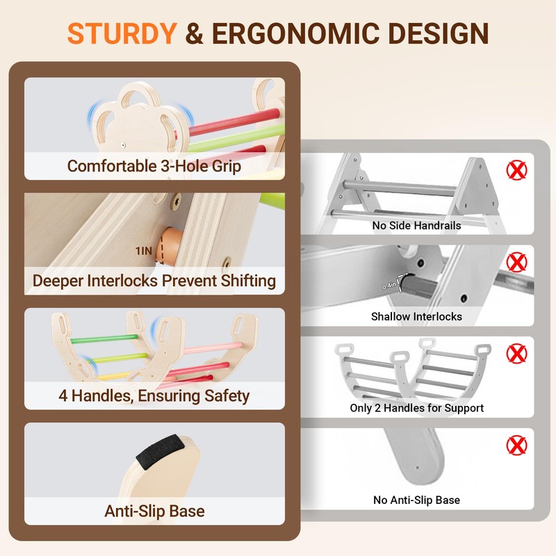 - ASTM-Certified Safety & Anti-Tip Pro Arch: Engineered with an innovative anti-tip arch and certified bars, this montessori climbing set design ensures secure play with zero traps or flips for worry-free fun