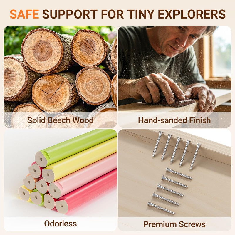 - Premium & Sturdy Construction: COSYLAND toddler climbing toys are made from solid beech wood with a hand-sanded, odorless finish, capable of supporting up to 180 lbs while preventing shifting during play for long-lasting durability and reliable safety