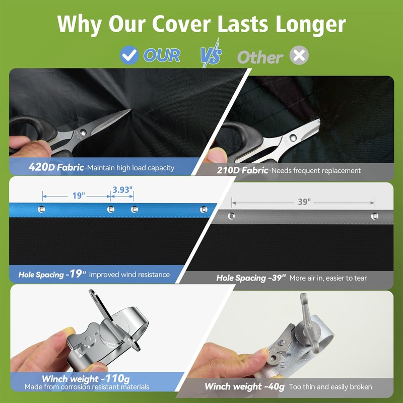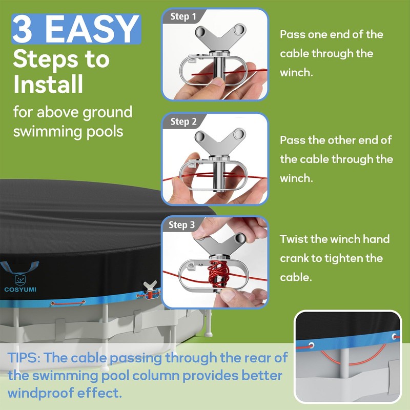 - 【Secure Tightening System】The upgraded zinc alloy winch with a spring mechanism makes installation effortless. Reinforced grommets are spaced just 19" and 4" apart (vs. the standard 39"). This enhanced configuration ensures a secure fit, even in extreme wind and rainstorms up to 80 mph, keeping your pool cover firmly in place.