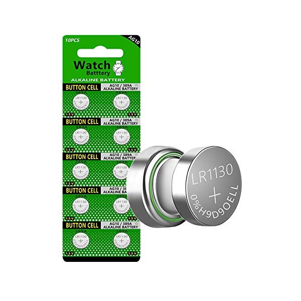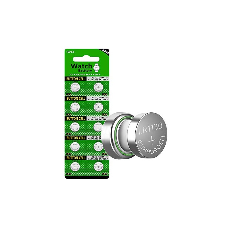 - Package of 10 AG10 1.5V alkaline button cell batteries for small electronics