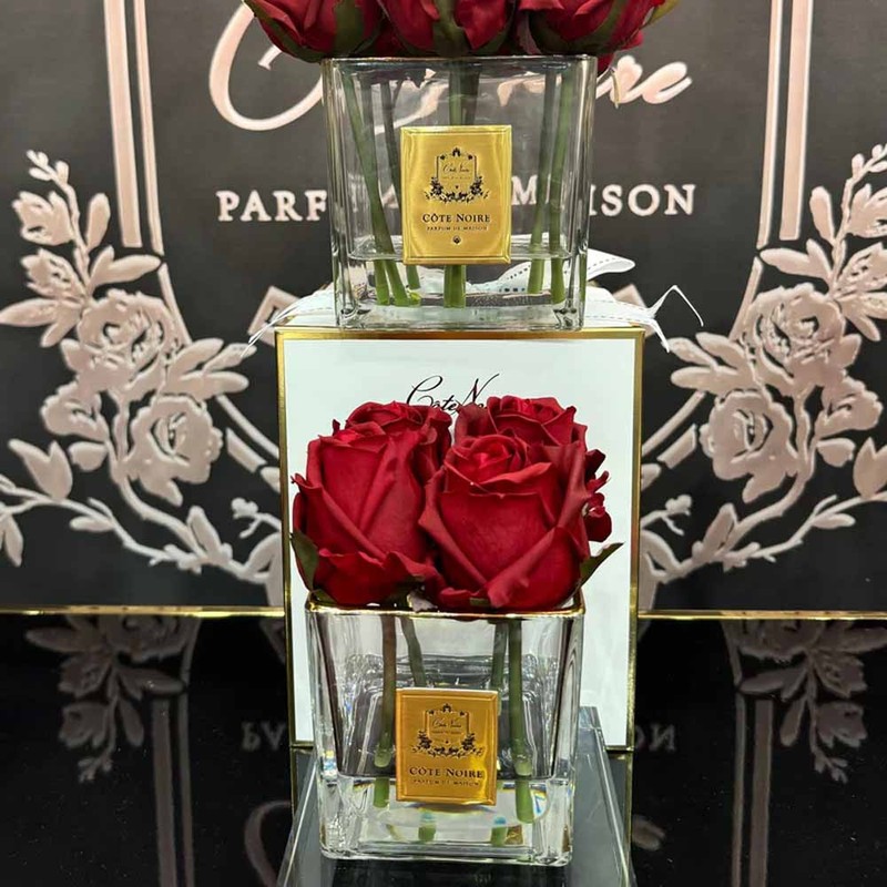 Each life-like perfumed 4 rose bud arrangement has been skilfully hand crafted and is set in gel giving it the appearance of water. Each petal has a special natural coating to give them a true to life touch and appearance. Arranged in a clear square vase with a gold signature Cote Noire Badge.
