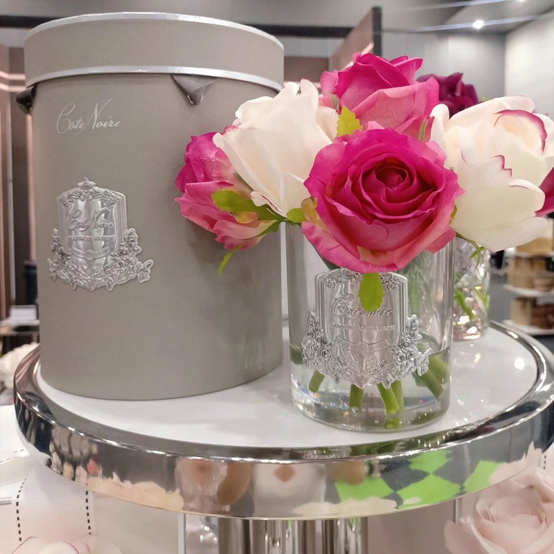 The Cote Noire Premium Bouquet in Mixed Magenta & Blush Rose Buds in Clear Glass draws inspiration from the tranquil life of provincial villages, we've curated a collection of robust fragrances that blend the essence of beloved patisserie treats with the succulence of fruits and the allure of florals.