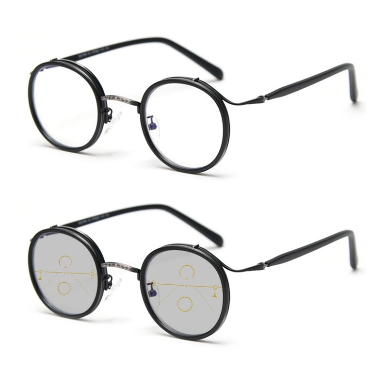 Progressive multifocal glasses are suitable for reading and looking at distant objects without frequent picking. The bottom part of the lens is full-power magnification, then used for nearly distance reading. The middle part is slightly reduced power magnification for working on computer, watching TV, etc. Top part is half-power magnification for walking, shopping and so on. It means that you can wear the glasses anytime and anywhere.