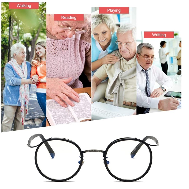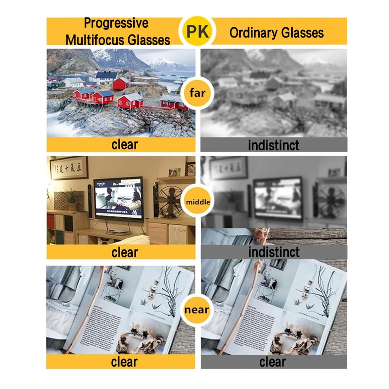 Progressive multifocal glasses are suitable for reading and looking at distant objects without frequent picking. The bottom part of the lens is full-power magnification, then used for nearly distance reading. The middle part is slightly reduced power magnification for working on computer, watching TV, etc. Top part is half-power magnification for walking, shopping and so on. It means that you can wear the glasses anytime and anywhere.