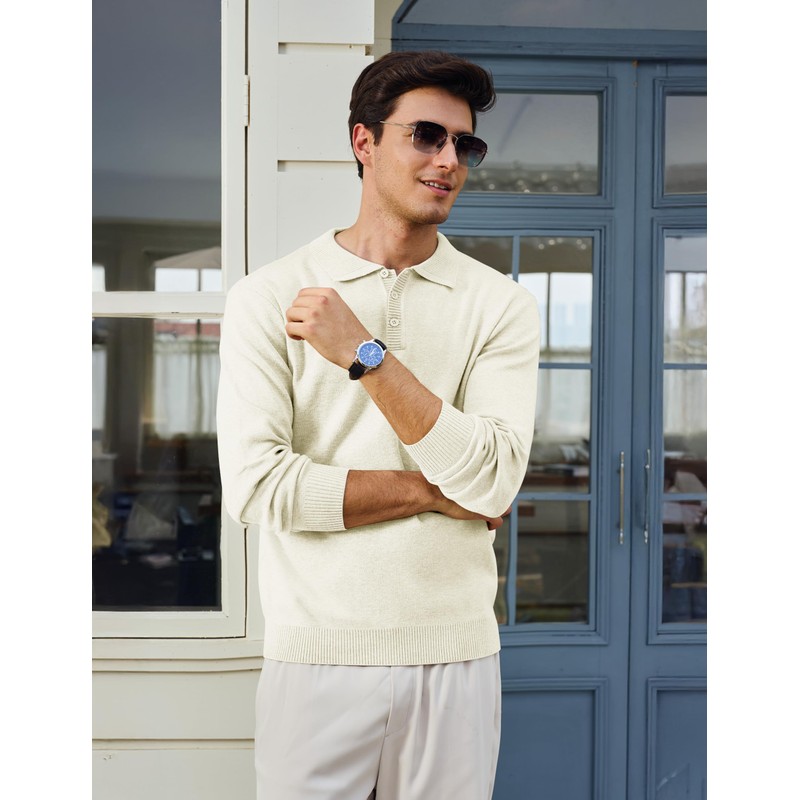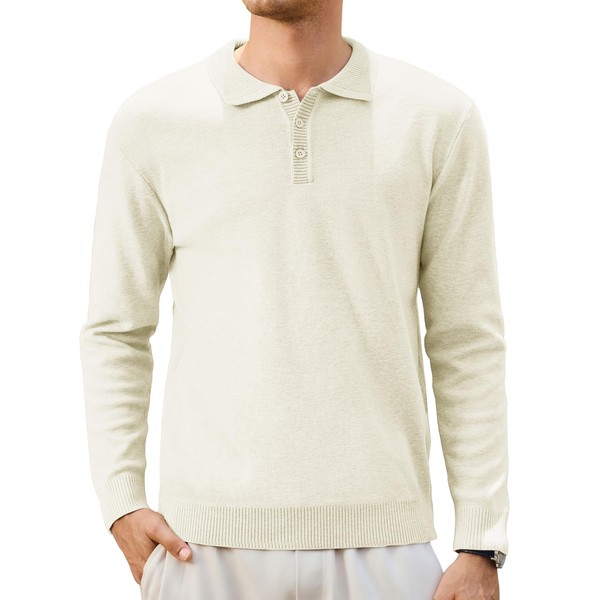 Cotrasen Men's Long Sleeve Polo Sweater Collared Pullover Lightweight Casual Golf Textured Polo Shirts Beige White M