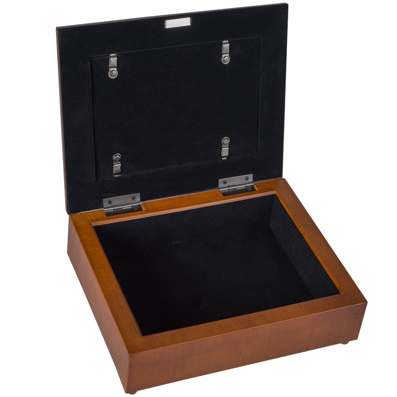 - Box is lined with classy black velvet. Stands on 4 wooden feet and helps prevent scratching surfaces.