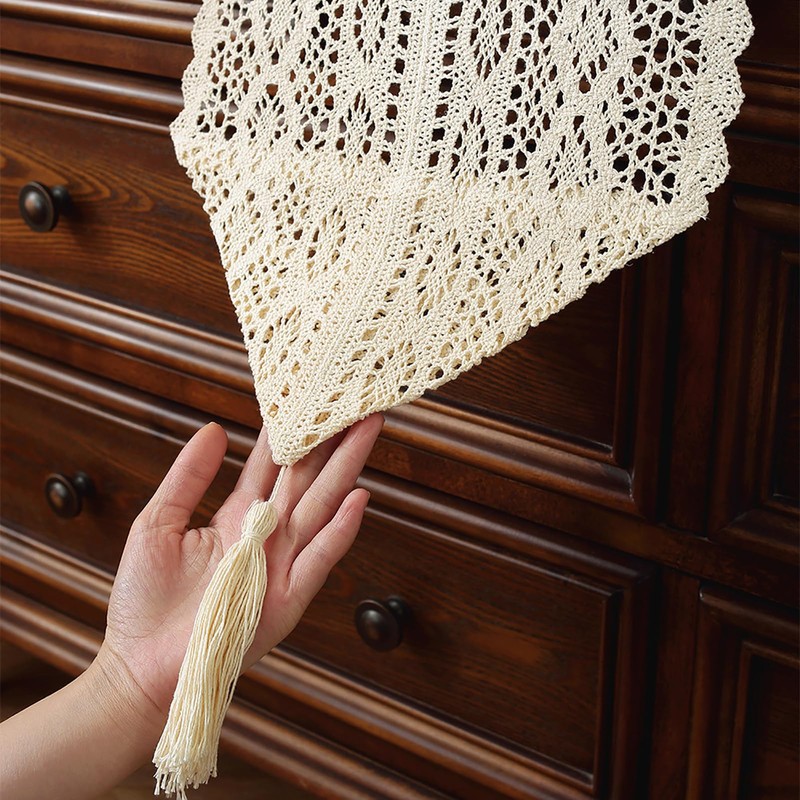 - Design: There are two triangle designs at both ends of the table runner with two pendants underneath, which is both beautiful and practical. The main color is beige with a hollow pattern design.