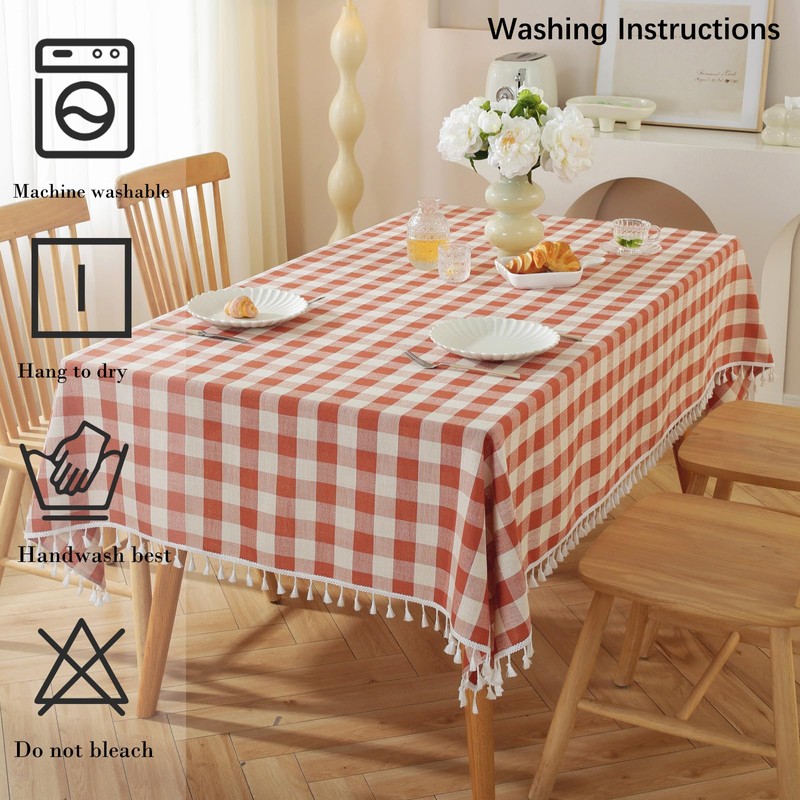 - Charming Gingham Design: Featuring a classic gingham pattern, this elegant tablecloth enhances your decor with a warm farmhouse aesthetic. The cute tassel edging adds a playful touch, making it perfect for a variety of decorating styles.