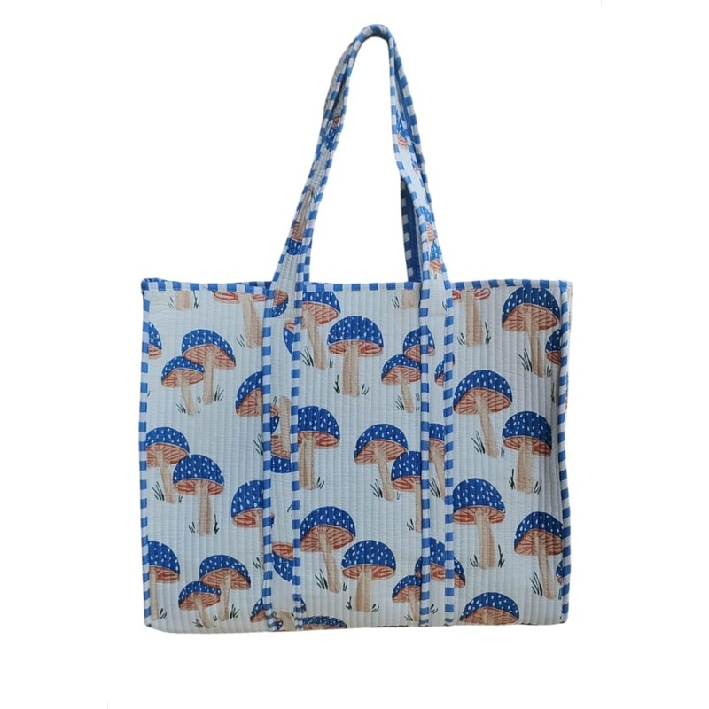 Cotton Quilted Tote Bag, Handmade Indian Shopping Shoulder Bag Mushroom Print