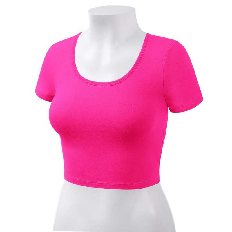 Women Cotton Scoop Neck Crop Tops Short Sleeve Basic Casual Shirts HOTPINK M