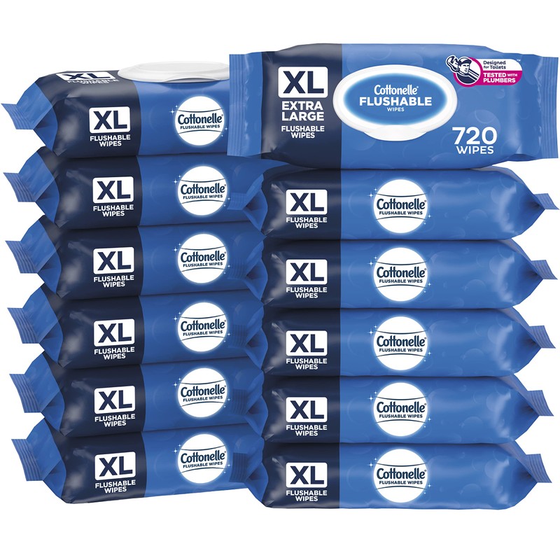 Cottonelle XL Flushable Wipes for Adults Extra Large FlipTop Packs, 60 Hypoallergenic Wipes per Pack, White, 720 Count, (Pack of 12)