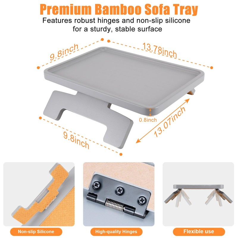 Couch Arm Tray,Surface with Anti-Slip Mat Sofa Table,Natural Bamboo Sofa Arm Tray,Food Trays for Eating On Couch (Gray)