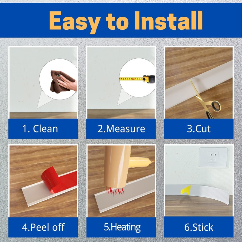 - NO MESS, NO RESIDUE:All Baseboard Molding Trim sets come with easy-to-peel backing tape that adheres securely to surfaces and can be removed easily.Please read our installation instructions for best results.The product package includes a roll of wall base moulding and a scraper.There may be damage during transportation, we provide free replacement.12-MONTH WARRANTY - 30 days free return & replacement, enjoy a purchase completely risk free.
