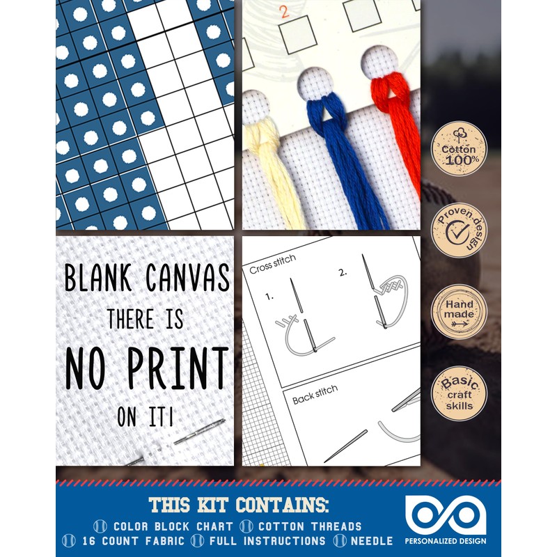 - ⚾ "Baseball: LAD" counted cross-stitch kit includes everything to create finished bookmark: pattern, guide, 16-count Aida cloth, threads, needle;