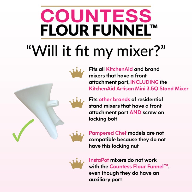 • The Countess Flour Funnel attaches firmly to a stand mixer's auxiliary port, and it is angled just right to easily add your flour (or any dry or liquid ingredients) to your bowl.