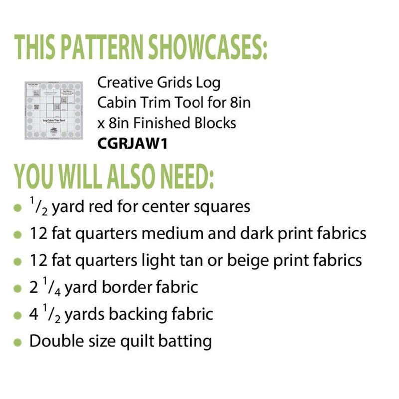 - Use Creative Grids Trim Tool (CGRJAW1) for 8 inch blocks (not included) to make this quilt