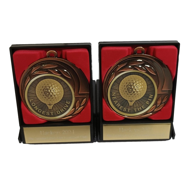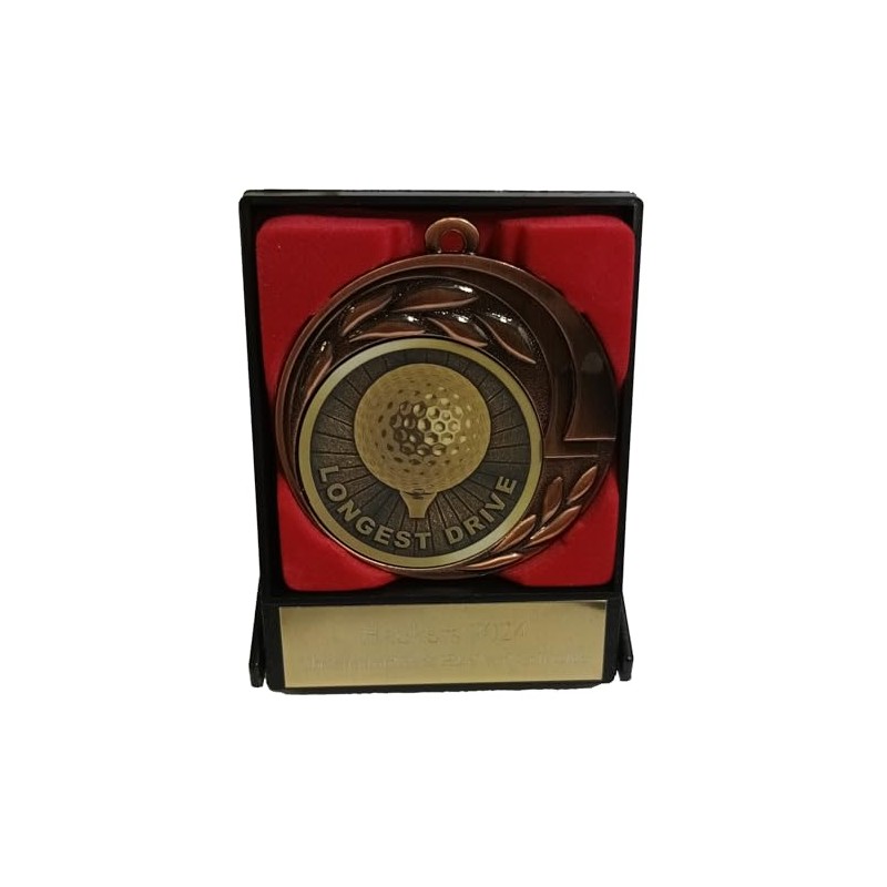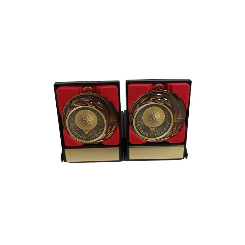 - Our medals feature a golf ball in the centre with the wording Longest Drive or Nearest The Pin around the edge. This medal is mounted inside a black display - storage case. A gold engraving plate can be attached to the outside of the case which we can engrave with your wording if required.