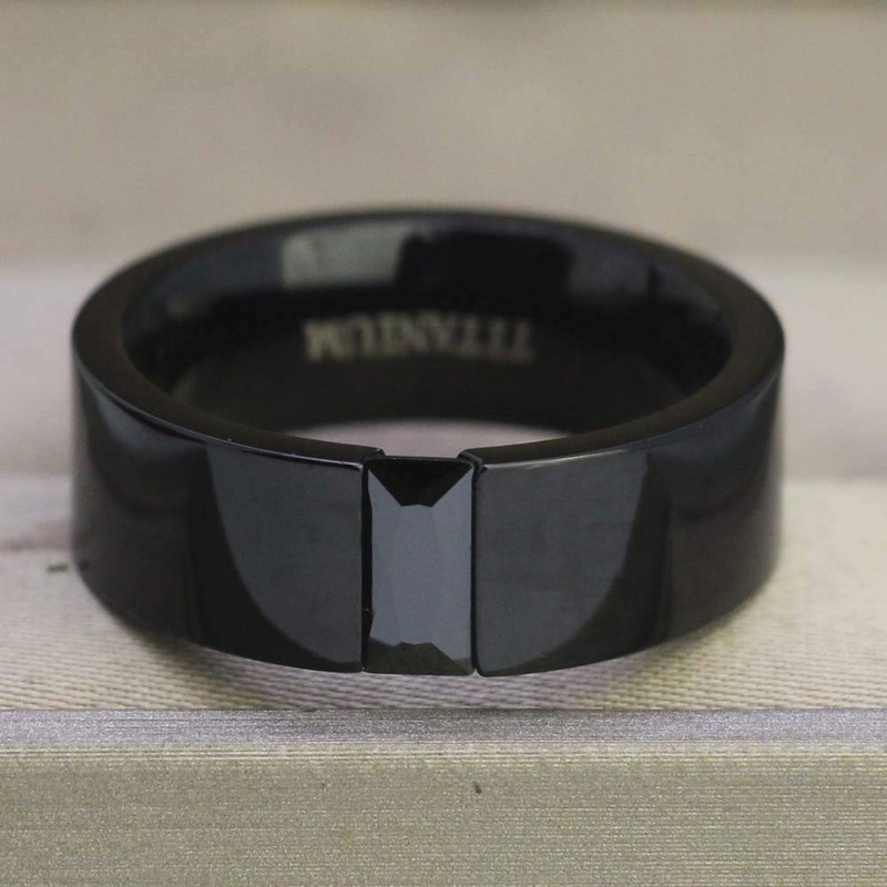 Men's 8 mm wide comfort fit wedding band.This men’s wedding band features AAA grade sparkly cubic zirconia. Interior of band is slightly rounded to provide a comfortable fit for daily wear. It is made of non-tarnish, high quality Titanium. Titanium jewelry is durable, and hypo-allergenic (nickel-free).