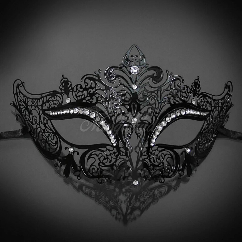 Materials/Techniques: Men's Mask: Paper Mache / Women's Mask: Quality filigree metal mask with rhinestones - fully adjustable ribbon ties for comfortable wear.
